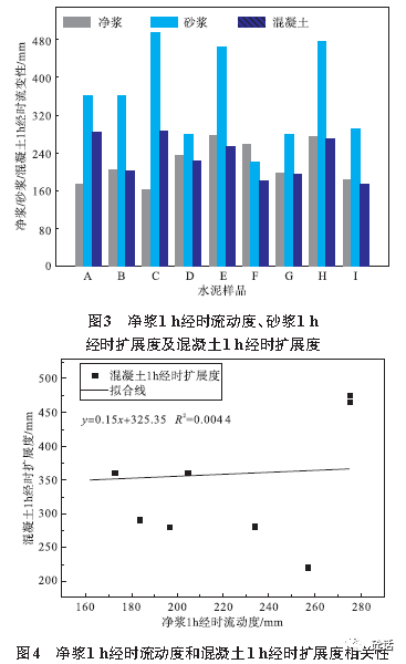 由表3和图3可以看到,9种水泥样品砂浆1h经时扩展度值由大到小排序为:C>A>H>E>D>B>G>F>I。砂浆1h经时扩展度最大的样品C,混凝土扩展度也为最大值,显示水泥砂浆扩展度与混凝土扩展度有显著相关关系;砂浆1h经时扩展度最小的样品I,混凝土扩展度值290mm,低于平均值358mm,显示水泥砂浆扩展度与混凝土扩展度没有显著相关关系;混凝土1h经时扩展度最小的样品F,砂浆扩展度为次低值,显示水泥砂浆与混凝土扩展度有较明显相关关系。